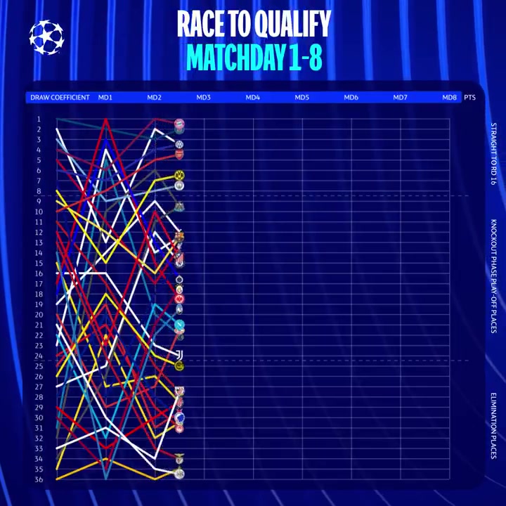 欧冠官方晒联赛阶段排名走势:阿森纳、拜仁最稳定
